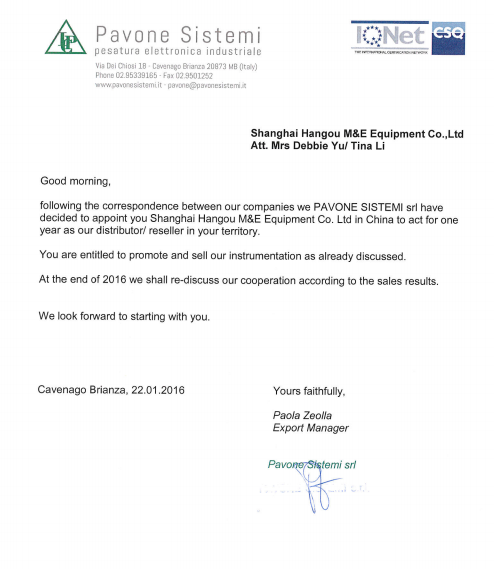 2016年1月意大利pavoneSistemi公司上海航歐機(jī)電設(shè)備有限公司